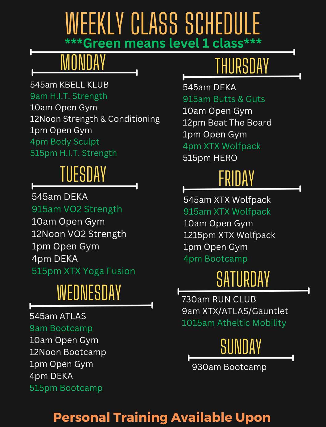 At Ruckhouse we offer a multitude of classes no matter where you are on your fitness journey. We have built our portfolio of class offerings over the years to offer something for everyone from personal training or bootcamps to training for races. The class schedule is designed to work together Monday-Friday, providing our members a complete fitness protocol to follow.